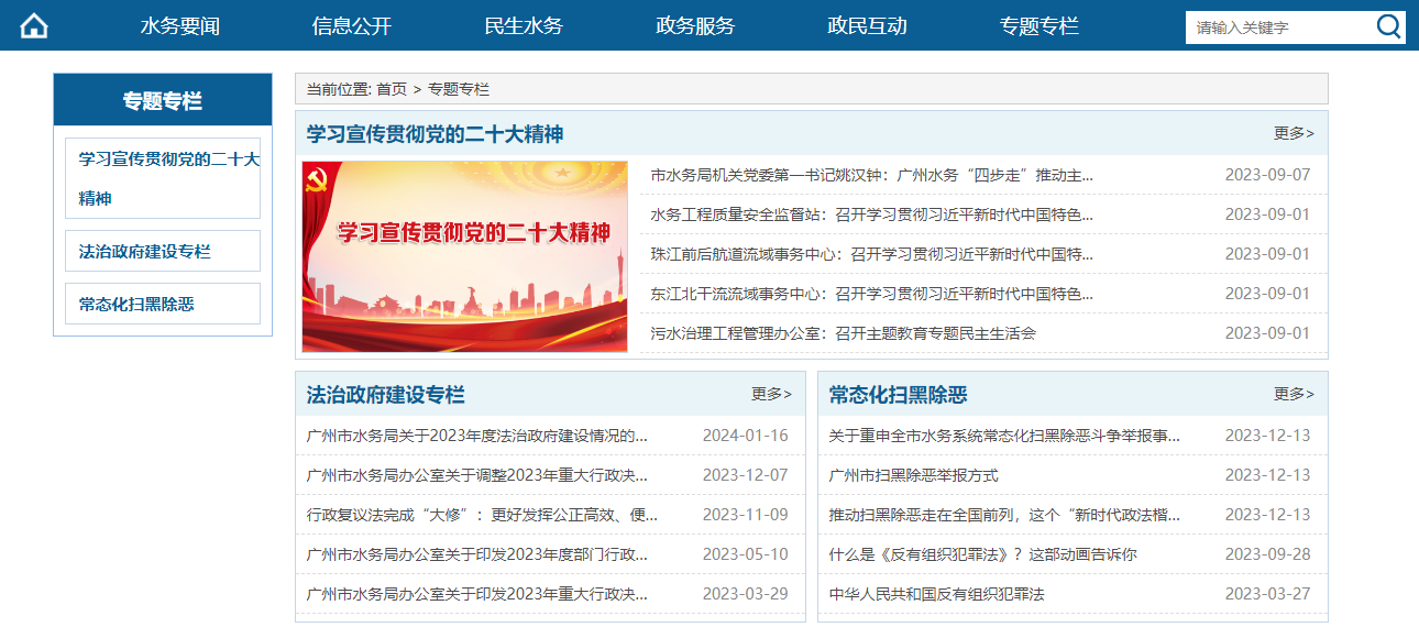 专题专栏栏目主要发布水务相关的各类专题专栏内容,如:学习宣传贯彻党的二十大精神、法治政府建设、常态化扫黑除恶等。